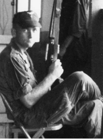 Photo of Capt. Paul W. Bucha communicating via radio in Phuoc Vinh, South Vietnam, on the morning of March 19, 1968. Week of