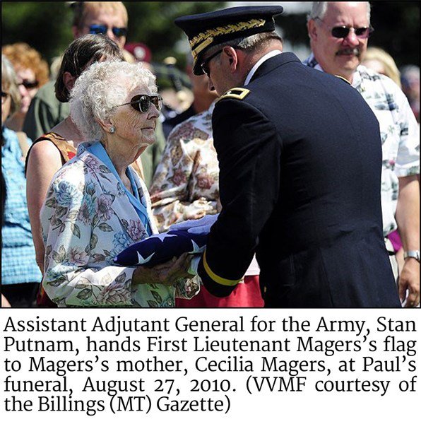 Stan Putnam, presents First Lieutenant Magers’ flag to Magers’ mother, Cecilia Magers, at Paul’s funeral