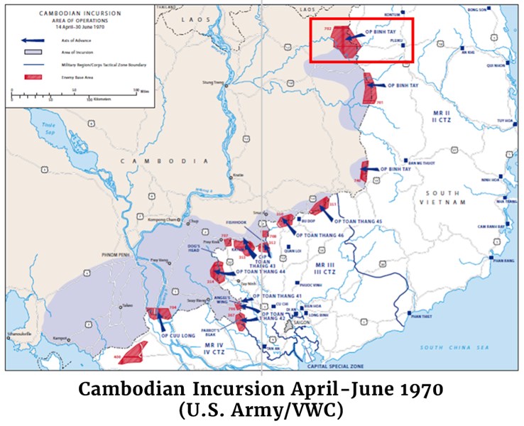 Sources: Graham A. Cosmas, United States Army in Vietnam: MACV—The Joint Command in the Years of Withdrawal, 1968–1973, Center of Military History, United States Army, Washington, D.C., 2006; Brigadier General Tran Dinh Tho, Indochina Monographs: The Cambodian Incursion, U.S. Army Center of Military History, Washington, D.C., 1979; Andrew J. Birtle & John R. Maass, The U.S. Army Campaigns of the Vietnam War , The Drawdown, 1970–1971, Center of Military History, United States Army, Washington, D.C., 2019; “Combat Operation After Action Report, Binh Tay I (Pacify West I), Cambodia, May 1970,” Texas Tech University, The Vietnam Center & Sam Johnson Vietnam Archive (accessed May 2, 2024); “Operation Binh Tay I,” Vietnam War Era (accessed May 2, 2024); “30 April 1970: The Cambodian Campaign,” Vietnam the Art of War (accessed May 2, 2024); “Wall of Faces,” Vietnam Veterans Memorial Fund, (accessed May 2, 2024); “The Virtual Wall,” Vietnam Veterans Memorial Wall (accessed May 2, 2024); Coffelt Database of Vietnam Casualties (accessed May 2, 2024)