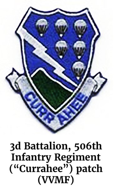 3d Battalion, 506th Infantry Regiment (“Currahee”) patch (VVMF)SUMMARY: On May 10, 1970, during Operation BINH TAY I, the northernmost advance of the Cambodian Incursion, 2d Platoon, B Company, 3d Battalion, 506th Airborne Infantry Regiment (“Currahee”), 101st Airborne Division was conducting a reconnaissance patrol near Se San in the Ratanakiri Province in northeastern Cambodia. At approximately 3:30 in the afternoon, the platoon was surrounded and attacked on every side by a numerically superior enemy force. The Currahees fought heroically, but nevertheless lost eight men killed in action, and 28 more wounded in the fight. Of those who died, four received Bronze Star Medals, one received a Silver Star Medal, and one received the Medal of Honor, the nation’s highest military award for valor, for their extraordinary gallantry on the battlefield..