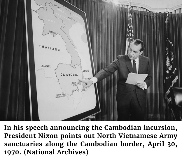 IPhoto of President Nixon in his speech announcing the Cambodian incursion, and pointing out North Vietnamese Army sanctuaries along the Cambodian border, April 30, 1970. (National Archives)FULL STORY: On March 18, 1970, communist-leaning Cambodian Chief of State Prince Norodom Sihanouk was deposed by a coup d'état. General Lon Nol assumed emergency powers, demanded that North Vietnam withdraw all troops from Cambodian territory, including along the Ho Chi Minh Trail, and by mid-April appealed to the Free World nations for help in ejecting the North Vietnamese Army (NVA) from their bases in Cambodia. In a nationally televised speech on April 30, 1970, President Nixon announced U.S. plans for a combined U.S and Army of the Republic of (South) Vietnam (ARVN) incursion to destroy NVA and Viet Cong sanctuaries in Cambodia.