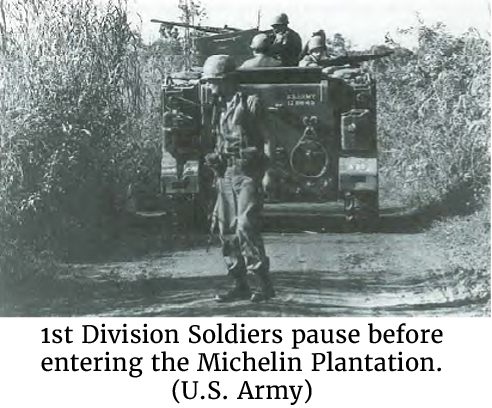 Two days later, the Big Red One launched Operation BUSHMASTER I on November 14, 1965. Enemy had been spotted in the Michelin Rubber Plantation, and the operation was set in motion to search the area. Two battalions, the 1st of the 16th Infantry and the 1st of the 28th Infantry air-assaulted southeast of the plantation an began moving toward Highway 13. Meanwhile, the 2d Battalion, 28th Infantry Regiment and the 2d Battalion, 33d Field Artillery headed up by convoy to act as a blocking force and provide artillery support.