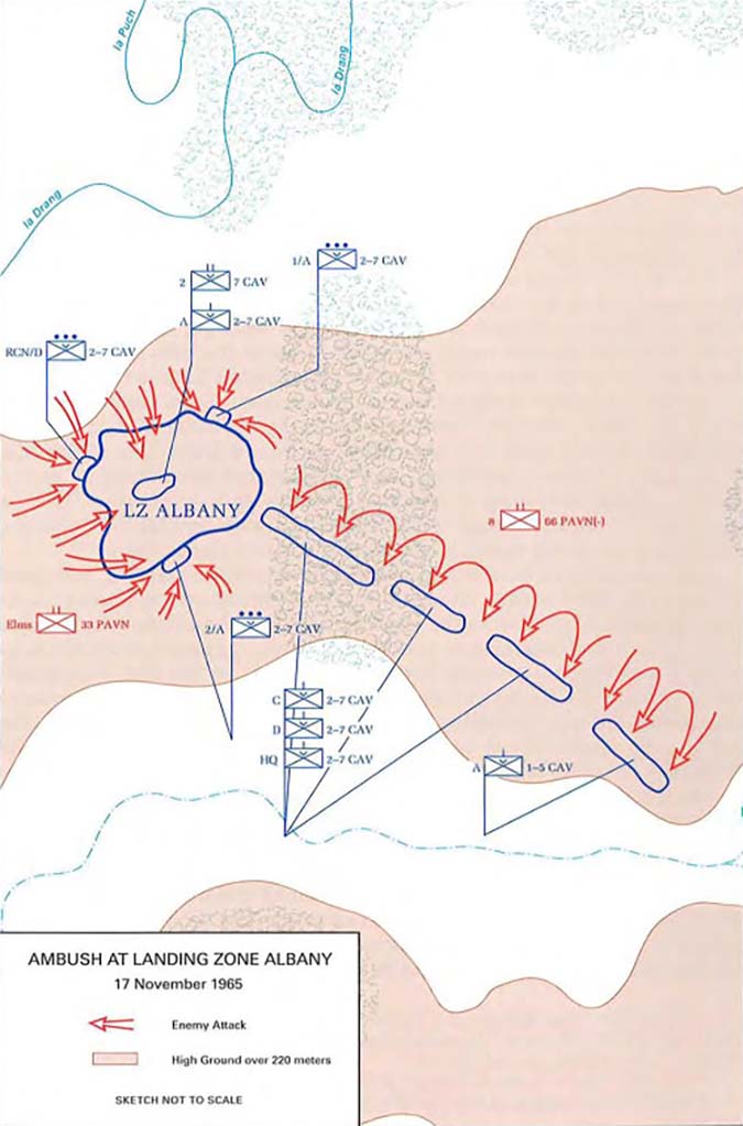 On November 17, elements of the 5th and 7th Cavalry Regiments, which had mostly arrived as reinforcements earlier in the battle, left X-Ray on foot to occupy additional nearby landing zones. The men of the 7th headed toward one called Landing Zone Albany, several kilometers away. As they approached Albany, commanders halted the column in order to coordinate troop placement. They did not know that several North Vietnamese battalions had moved into positions just northeast of Albany. These enemy forces set up an ambush on the American column, and when they opened up in the early afternoon with mortar, machine gun, and rifle fire, the spread-out column of Americans “dissolved into confusion,” in the words of one U.S. captain. The firefight was intense and devastating. Making matters worse, U.S. units were disorganized, and tall grass and snipers concealed in the tree line made organizing a defense difficult.
