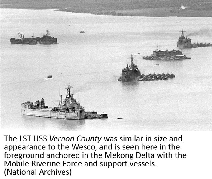 The LST USS Vernon County was similar in size and appearance to the Wesco, and is seen here in the foreground anchored in the Mekong Delta with the Mobile Riverine Force and support vessels. (National Archives)The Wesco was 380 feet long and well stocked. Anchored in the middle of the My Tho River, approximately 40 miles upstream from the sea, the LST housed 175 sailors and dozens of Army troops from the 34th Artillery, 3d Battalion, 9th Infantry Division. The assault boats of River Assault Squadron 11 were moored to a floating pier alongside the ship. The Wesco was also well guarded, with sentry boats and guards placed throughout the ship and its attached floating support vessels and facilities. The excess of guards was necessary. The American servicemen who lived and slept aboard the Wesco were sleeping atop an enormous bomb. In addition to its complement of assault boats, it had two UH-1 “Huey” helicopters stationed on its top deck; enormous amounts of aviation and marine fuel; roughly 10,000 large-caliber artillery rounds; and stacks of C4 explosives, claymore mines, white phosphorous ordnance, and flares.