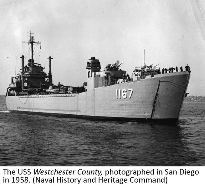 The USS Westchester County, photographed in San Diego in 1958. (Naval History and Heritage Command)FULL STORY:  The USS Westchester County, known in the fleet as the “Wesco,” was one of numerous LSTs produced during and immediately after World War II. They were designed to land large numbers of troops and vehicles directly onto beaches, but during the Vietnam War they were pressed into service as essentially floating bases, barracks facilities, and warehouses. They were especially needed in the vast Mekong Delta, a Viet Cong stronghold which had little contiguous solid ground on which to build bases or conduct large scale combat operations.