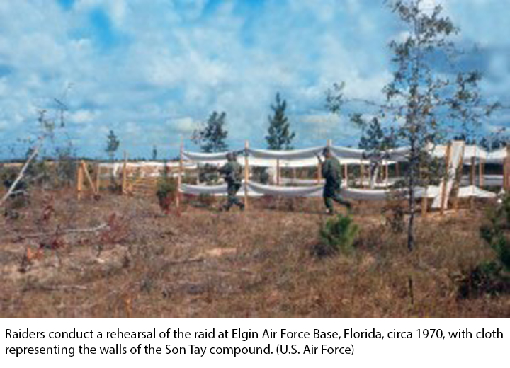 The Department of Defense chose the codename Operation IVORY COAST for the raid on Son Tay. Colonel Simons and the other ranking officers handpicked 103 volunteers from the 6th and 7th Special Forces Groups. The soldiers trained at Elgin Air Force Base, Florida, in order to prepare for the humid weather and marshy terrain near the prison site. They memorized both scaled down and full-size mockups of the Son Tay Prison complex and rehearsed the raid, down to the smallest movements, nearly 200 times. Leaders eventually settled on November 21 as the date for the mission.  Raiders conduct a rehearsal of the raid at Elgin Air Force Base, Florida, circa 1970, with cloth representing the walls of the Son Tay compound. (U.S. Air Force)