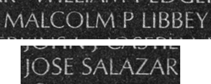 The names of Staff Sergeant Malcolm Pierce Libbey and Private First Class Jose Salazar inscribed on The Wall.,For protecting Salazar and giving him time to radio for reinforcements despite his severe wounds, Libbey posthumously received the Silver Star medal for valor. He and Salazar are memorialized together on Panel 27E, Lines 95–96, of the Vietnam Veterans Memorial in Washington, D.C.