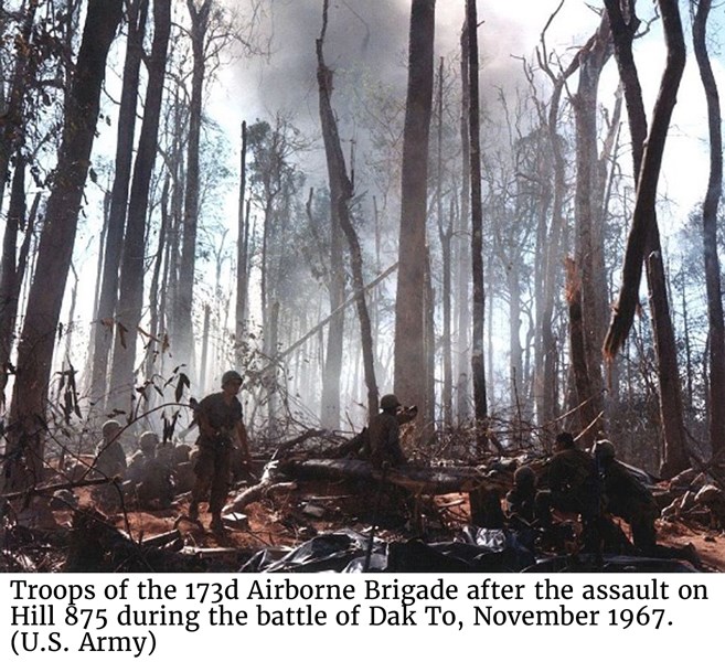 Troops of the 173d Airborne Brigade after the assault on Hill 875 during the battle of Dak To, November 1967. (U.S. Army)Each South Vietnamese unit during the war had a team of American military advisers assigned to them. For the 4th Battalion, it was MACV Advisory Team 86. The 4th Battalion’s Light Weapons Infantry adviser from Team 86 was Staff Sergeant Malcolm P. Libbey, a 37-year-old former Drill Instructor from Rockland, Maine, and a 10-year veteran of the Army. When the Viet Cong attack began, Libbey ran for Team 86’s command bunker, where most of the other advisers on base had gathered. Before the men in the bunker could organize a defense, guerrillas rolled two grenades inside. When they detonated, they sprayed shrapnel throughout the space and filled the bunker with choking smoke. Libbey was grievously wounded, but remained conscious. He was also unable to see for the smoke, and when no one else responded to his voice he assumed the rest of the bunker’s occupants had been killed. He next moved outside and dashed across the base through murderous small arms fire toward the advisory team’s headquarters building, where he hoped to radio for help.