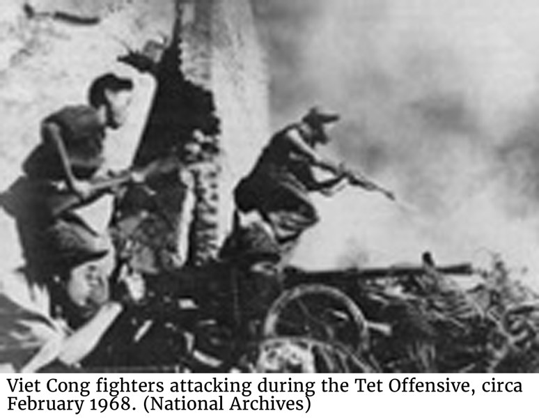 Viet Cong fighters attacking during the Tet Offensive, circa February 1968. (National Archives)To prepare for the general offensive, scheduled for early 1968, Le Duan directed the North Vietnamese Army and the Viet Cong insurgency in the South to begin a series of preliminary attacks in late 1967. Since the general offensive was to be waged from within South Vietnam’s cities and towns, Communist leaders designed these preparatory attacks to distract the United States’ armed forces and to empty most urban areas of American troops. North Vietnamese troops began the siege of the U.S. Marine Corps base at Con Thien in September, surrounding it with approximately 10,000 troops. Viet Cong guerrillas attacked a string of remote U.S. and South Vietnamese bases in the western countryside in September and October, including most famously the attack on Loch Ninh Special Forces Camp. Later, in November, Communist troops surrounded and attacked American forces at Dak To, initiating a battle that lasted more than three weeks. In particular, Communist attackers were keen to target South Vietnamese military installations, because Le Duan and his followers believed by doing so they could destroy what remained of the morale of South Vietnam’s soldiers and perhaps even spark the disintegration of South Vietnam’s armed forces altogether.