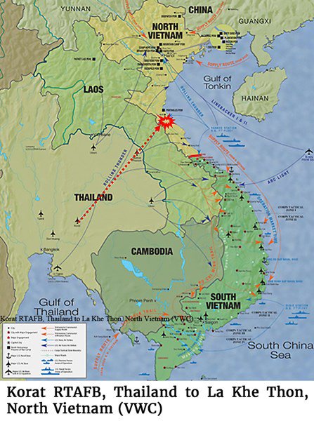 Map of Korat RTAFB, Thailand to La Khe Thon, North Vietnam (VWC)SUMMARY: On October 18, 1965, a U.S. Air Force F-4C Phantom II (tail number 64-0730), from the 68th Tactical Fighter Squadron, 6234th Tactical Fighter Air Wing at Korat Royal Thai Air Force Base in Thailand took off on a mission to bomb a bridge near La Khe Thon in the Ha Linh Province of North Vietnam, about 35 miles south of Vinh. The plane was shot down by antiaircraft fire. The pilot and the back seater ejected successfully, and both were injured and captured immediately when their parachutes hit the ground. They spent the next seven-and-a-half years as prisoners of war (POWs) at camps in North Vietnam. They were released on February 12, 1973 under the terms of the Paris Peace Accords.