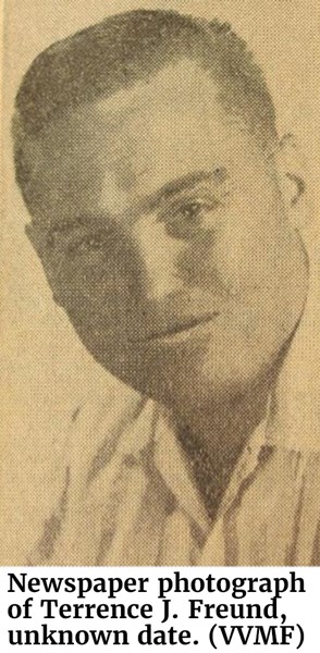 Newspaper photograph of Terrence J. Freund, unknown date. (VVMF)Freund was a 24-year-old radioman and machine gunner from Sheboygan Wisconsin. He enlisted in the Navy just after his 18th birthday after dropping out of Sheboygan High School during his senior year. He was a six-year veteran of the service in October 1966, assigned to a river patrol boat in Navy Task Force 116, a unit tasked with patrolling the labyrinthine waterways of the Mekong Delta pursuing the Viet Cong. Just two weeks prior to October 26, Freund had reenlisted in the Navy, having told his mother that he wanted to make the service his permanent career.