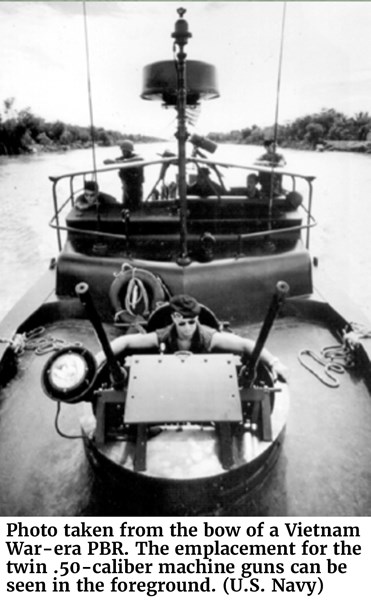Photo taken from the bow of a Vietnam War-era PBR. The emplacement for the twin .50-caliber machine guns can be seen in the foreground. (U.S. Navy)The workhorse vessel of Operation GAME WARDEN was the “Patrol Boat, River,” more famously known as the PBR. Introduced in early 1966, the PBR was 31 feet long and could move at a speed of up to 30 knots. Designers made the PBR light and maneuverable. Its shallow draft and jet engines meant it could access virtually any spot where objects could still float—down to 2 feet of water. But it came at a cost. The boat’s hull was made of fiberglass, making it and its crew of four highly vulnerable to small arms fire. Though PBRs were armed with three .50-caliber machine guns and sideboard grenade launchers for defense and short-duration firefights, it was not built for sustained combat against an entrenched enemy. PBRs mostly worked in pairs—one “lead” and one “cover” boat—and their crews had standing orders to withdraw if they met heavy resistance and then call in air or artillery support. Ambushes were particularly deadly for PBR crews.