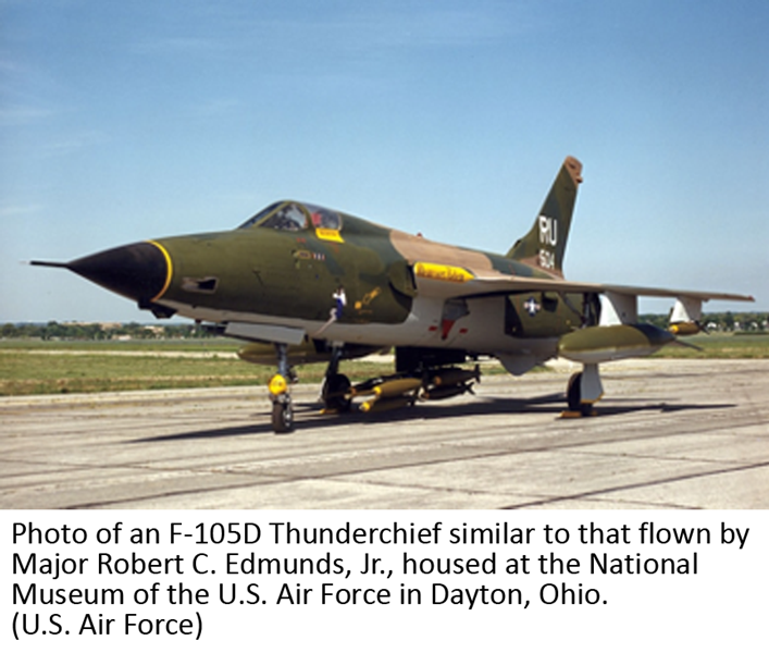 SUMMARY:  On the afternoon of October 27, 1968, U.S. Air Force 1st Lieutenant Robert C. Edmunds, Jr., lifted off the tarmac at Korat Royal Thai Air Base in his F-105D Thunderchief and headed northeast toward North Vietnam. He never returned. Edmunds’s aircraft was shot down over his target in Quang Binh Province. Listed as missing in action, he became the last pilot to be killed or listed as missing during Operation ROLLING THUNDER, one of the longest and most significant bombing operations in history. The four-year air campaign ended officially four days after he crashed. Edmunds’s remains were not recovered and identified until 20 years later.