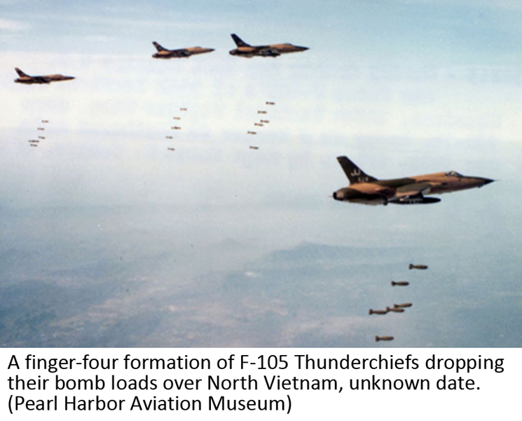 A finger-four formation of F-105 Thunderchiefs dropping their bomb loads over North Vietnam, unknown date. (Pearl Harbor Aviation Museum)Over the duration of ROLLING THUNDER, the Air Force, Navy, and Marine Corps flew 304,000 fighter/bomber sorties and nearly 2,400 B-52 sorties. America lost almost 1,000 aircraft, and nearly that many American aviators were killed, missing, or captured. But the North Vietnamese sustained the worst toll. Though the precise number is debated and difficult to accurately quantify, many tens of thousands of North Vietnamese were killed during the operation, most of whom were civilians.