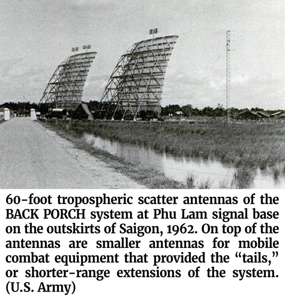 Photo provided by the U.S. Army of their BACK PORCH system in 1962.The United States Military Assistance Command, Vietnam (MACV) was established in February 1962 to take over all U.S. military policy, operations, and assistance in South Vietnam. Increased U.S. military presence and activity required increased communications capabilities. Secretary of Defense Robert S. McNamara approved the establishment of a “modern, reliable, large-capacity communications system that could provide high-quality telephone and message circuits between key locations in Vietnam.” The system was codenamed BACK PORCH. It provided multiple circuits between locations more than 200 miles apart using brand new tropospheric scatter radio antennas, which did not require line of sight because they used radio signals bounced off the troposphere.