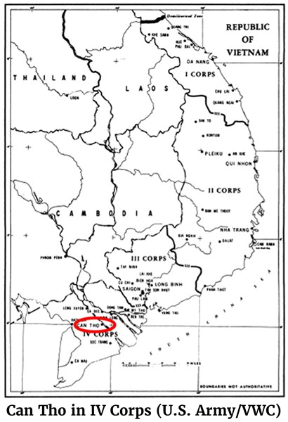 Map of Can Tho in IV Corps (U.S. Army/VWC)A contingent of the 232d Signal Company was billeted in Can Tho, Phong Dinh Province, the second largest city in South Vietnam at the time. Some of the signalmen lived in a building known as Town House, which included a collection of vibrant shops and apartments. On the afternoon of November 4, 1962, a Sunday, a Viet Cong terrorist rolled a hand grenade towards the entrance of Town House justas two American Soldiers were exiting. One of the Soldiers tried to save some Vietnamese children who were playing in the arcade, but died in the attempt, along with two of the children.