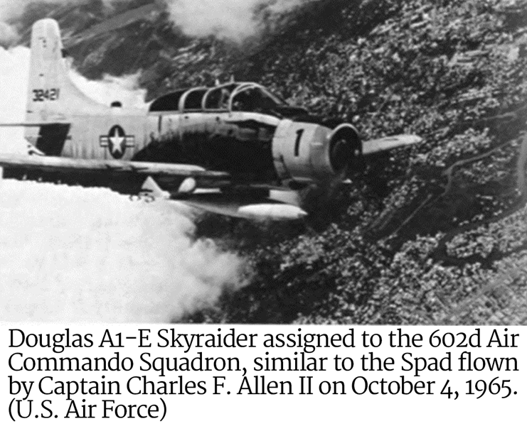 fire for an airstrike by U.S. Air Force Captain Charles F. Allen II, pilot of a Douglas A1-E Skyraider, a.k.a. Spad. Official records conflict as to what exactly transpired that day, whether the two aircraft collided mid-air or were shot down by enemy small arms fire. What is certain, however, is that both the helicopter and Spad crashed, leaving no survivors.