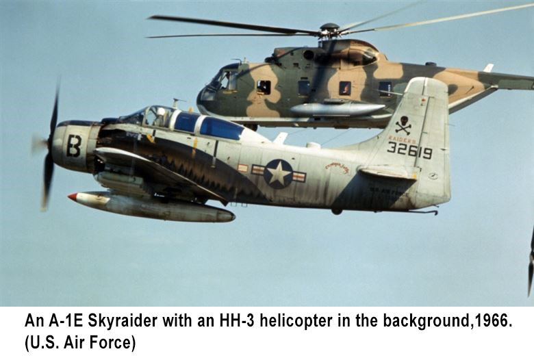 In late 1964, the United States was not yet officially involved in the Vietnam War, but it was heavily invested in preserving a non-Communist South Vietnam. More than 20,000 American service people were in Southeast Asia serving primarily as military advisers to the South Vietnamese armed forces, and the war was going poorly. In the early 1960s, U.S. Air Force pilots were only supposed to be training their Vietnamese counterparts, not conducting combat missions. But as South Vietnam’s military and political positions grew more tenuous in 1964, American aviators began actively flying combat missions. They would always do so accompanied by South Vietnamese trainees in order to maintain plausible deniability should they be shot down.An A-1E Skyraider with an HH-3 helicopter in the background, 1966. (U.S. Air Force)
