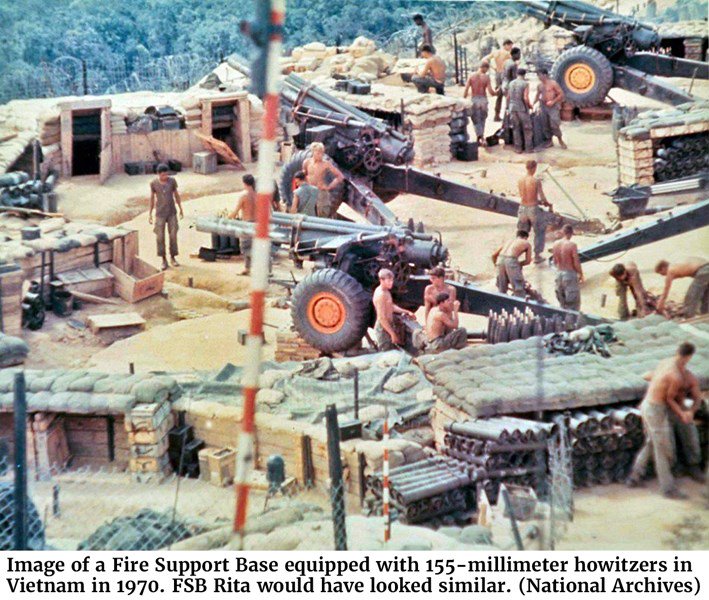 In October and November 1968, American forces fighting near the Fishhook were engaged in Operation TOAN THANG II. A joint operation involving South Vietnamese and American forces, TOAN THANG II lasted from June 1968 to February 1969 and was designed to follow up the crushing defeat of the Viet Cong’s Tet Offensive by putting pressure against the semi-permanent Communist bases along the Cambodia border. The FSBs that dotted the area boasted batteries of long-range artillery that could harass any enemy troops who crossed into South Vietnam and support allied ground forces fighting in the area. One of the most crucial of those bases was FSB Rita. On November 1, 1968, Rita was manned by the 1st Artillery Battalion, 5th Artillery Regiment.