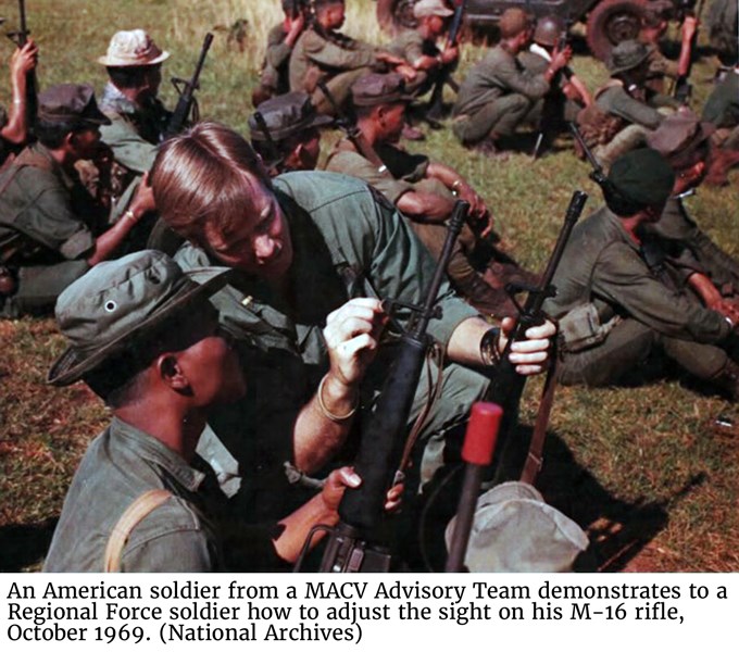 An American soldier from a MACV Advisory Team demonstrates to a Regional Force soldier how to adjust the sight on his M-16 rifle, October 1969. (National Archives)Throughout the 1960s, North Vietnam encouraged and directly sponsored Communist insurgents’ attempts to destroy the Saigon government’s influence among South Vietnamese civilians. They used propaganda and recruitment efforts combined with mechanisms of extortion, exploitation, and violence to exert control over the countryside. In order to fight this, CORDS and the United States Military Assistance Command, Vietnam (MACV), raised and armed local militia groups (known as Regional and Popular Forces) and deployed teams of military advisers to assist the militia with village security. These advisory teams worked with village leaders to coordinate their defenses, frequently traveling between villages on rural roads and trails for their duties.