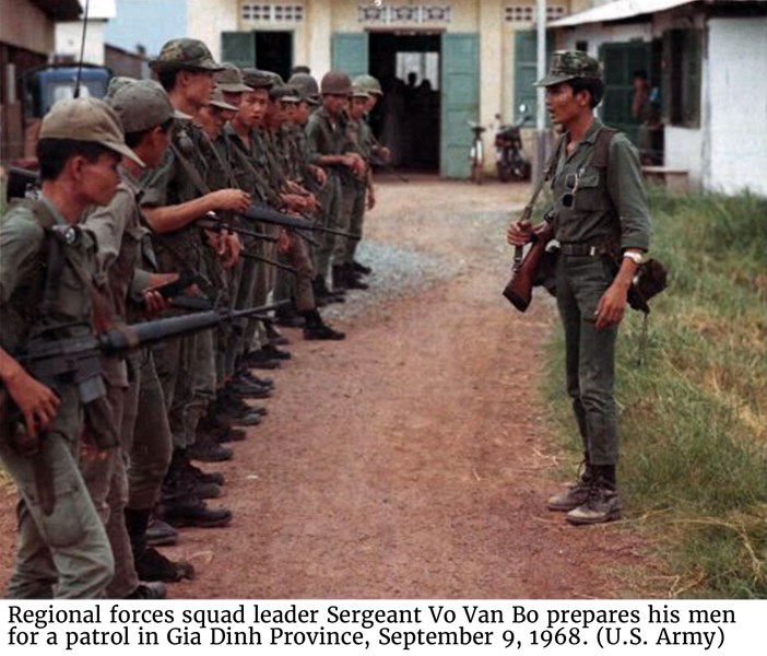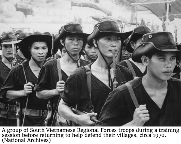 A group of South Vietnamese Regional Forces troops during a training session before returning to help defend their villages, circa 1970. (National Archives)Pacification involved numerous Saigon government and American-sponsored programs and thousands of personnel with the common goal of countering Communist influence and propaganda in South Vietnamese villages and improving the daily lives of their residents. Pacification included civic action programs—the construction of schools and community centers; provision of medical, dental, economic, and food aid; etc.—as well as security, giving Vietnamese hamlets the ability to protect themselves from Communist troops and guerrillas. It was such a multifaceted and complex effort that in May 1967 the United States brought the entire pacification effort under the ostensible control of a single new agency, the Office of Civil Operations and Rural Development Support, or CORDS for short.