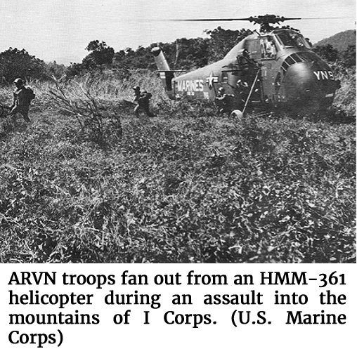 Photo of ARVN troops as they fan out from an HMM-361 helicopter during an assault into the mountains of I Corps. (U.S. Marine Corps)Two Marine helicopters and an Army L-19 Bird Dog were dispatched immediately to the crash site on a SAR mission. The L-19 pilot reported losing radio contact with the two helicopters and returned to base at approximately 7:30 p.m. Search operations that evening were stymied by darkness and deteriorating weather conditions, but commenced at first light the following day. By this time the crash site had been discovered by the Viet Cong who prepared stiff resistance to recovery operations, which continued for several days. The bodies of the Air Force pilot and two of the Marines were not recovered at the time.