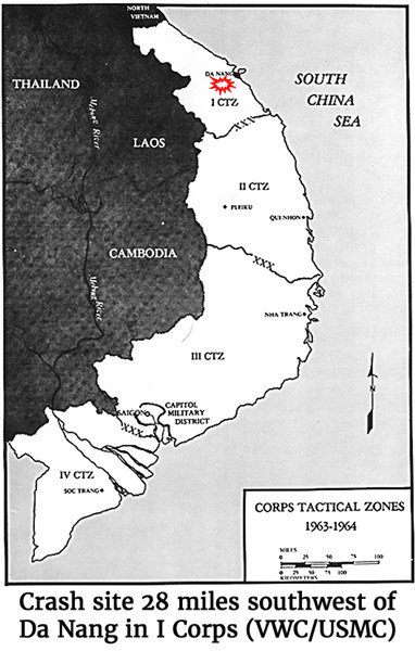 Msp of the crash site 28 miles southwest of Da Nang in I Corps (VWC/USMC)SUMMARY: On October 3, 1963, an American Air Force T-28B Trojan pilot from 1st Air Commando Squadron, 34th Tactical Group, 13th Air Force, crashed 43 miles southwest of Da Nang in I Corps. He and his South Vietnamese crewman were flying combat support and had just completed a bombing mission when the left wing failed, and the airplane broke apart. Both men were killed when the plane hit the ground and exploded. Shortly afterwards, two U.S. Marine UH-34D helicopters from Marine Medium Helicopter Squadron 361 (HMM-361), Marine Aircraft Group 16 (MAG-16), 1st Marine Aircraft Wing (1st MAW), flew out with an Army L-19 fixed-wing light observation aircraft on a search and rescue mission (SAR) for the downed Republic of [South] Vietnam Air Force (RVNAF) T-28B. As they approached the crash site, the helicopters took enemy fire. One was hit, went into a tailspin, and collided with the other helicopter. Both crashed and burned, killing all nine Marines and three Navy corpsmen aboard the two aircraft.