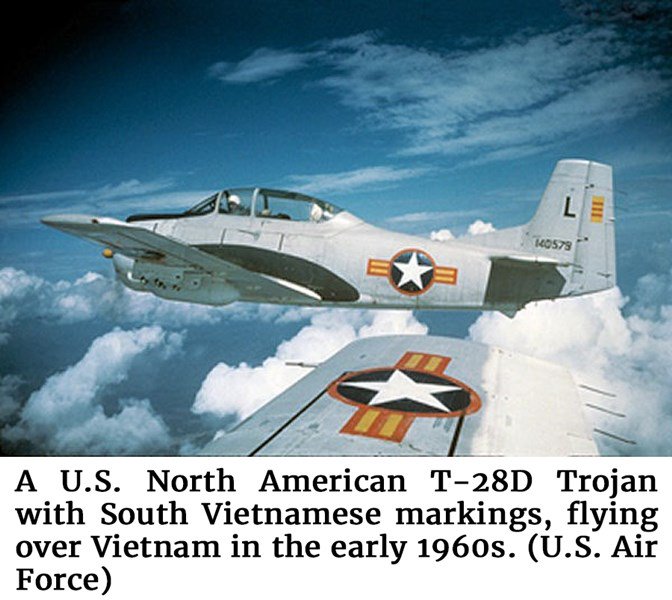 Photo of a U.S. North American T-28D Trojan with South Vietnamese markings, flying over Vietnam in the early 1960s. (U.S. Air Force)The squadron flew Korean War-era Douglas B-26 Invaders (attack bombers), SC-47 Skytrains (transport aircraft, sometimes called Gooney Birds), and North American T-28 Trojans (trainer aircraft, outfitted for combat). The Invaders and Trojans had serious maintenance issues. Spare parts were hard to come by, and the old planes sometimes just came apart.
