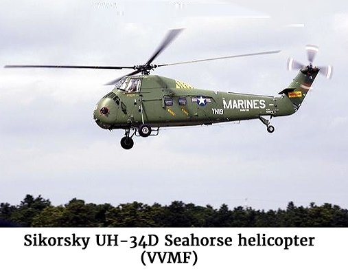 Photo of a Sikorsky UH-34D Seahorse helicopter (VVMF)On October 8, 1963, excessive G-forces caused a RVNAF trainer aircraft to fragment midair while pulling up after dropping bombs on a target in what was at the time hostile territory in Quang Nam Province southwest of Da Nang in I Corps. The T-28B Trojan was one of a flight of two aircraft. The pilot of the lead aircraft reported that the wing came off his wingman’s aircraft, then other parts fell away, and the plane crashed and exploded on impact. Neither the pilot nor his South Vietnamese counterpart had escaped before the aircraft hit the ground.