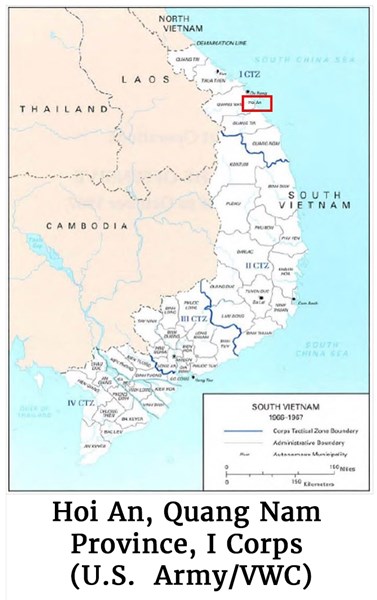 Map of the Hoi An, Quang Nam Province, I Corps (U.S. Army/VWC)FULL STORY: By September 1966, the United States Marines in southeastern I Corps were primarily engaged in pacification efforts, protecting villages and hamlets, and disrupting Viet Cong (VC) guerrilla operations. 1st Battalion, 1st Marine Regiment, 1st Marine Division—the 1/1 Marines—was headquartered in Da Nang on the South China Sea in Quang Nam Province, the southernmost province in I Corps. The 1/1 Marines were at that time responsible for the eastern part of the Da Nang Tactical Area of Responsibility (TAOR), from Da Nang down to the coastal city of Hoi An, just under 20 miles south.