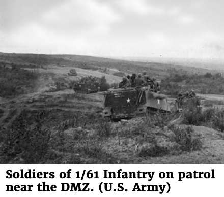 Photo of soldiers of 1/61 Infantry on patrol near the DMZ. (U.S. Army)In February 1969, Papa Company, 75th Infantry was added to the 5th Infantry Division’s order of battle. It was activated primarily to provide reconnaissance, surveillance, and target acquisition for the division. As the company was all-volunteer, and mostly made up of Army Rangers, it specialized in LRRP missions deep in enemy occupied areas, especially around the DMZ. Six-man “hunter-killer” teams were inserted by helicopter (or sometimes by armored personnel carriers or even tanks) into an assigned two- or three-square mile area called a “box.” They would recon and observe enemy activity usually for four or five days, then ambush the NVA just before extraction. They had full access to artillery, both land and sea-based air support, and naval gunfire, and they utilized these assets effectively.