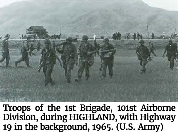 Photo provided by the U.S. Army of Troops of the 1st Brigade, 101st Airborne Division, during HIGHLAND, with Highway 19 in the background, 1965.FULL STORY: The United States Army’s 1st Brigade, 101st Airborne Division launched Operation HIGHLAND on August 22, 1965. The objective of the operation was to ensure the safe arrival in country of the 1st Cavalry Division (Airmobile). This required uncontested debarkation of the division at Qui Nhon, secure transport along Highway 19 to An Khe, the site of the 1st Cav’s new base camp, and perimeter defense and security while new base was set up. From late August to nearly the end of September, the 1st Brigade conducted almost two dozen smaller operations involving patrols, sweeps, and search and destroy missions in furtherance of keeping Highway 19 open and free from molestation.