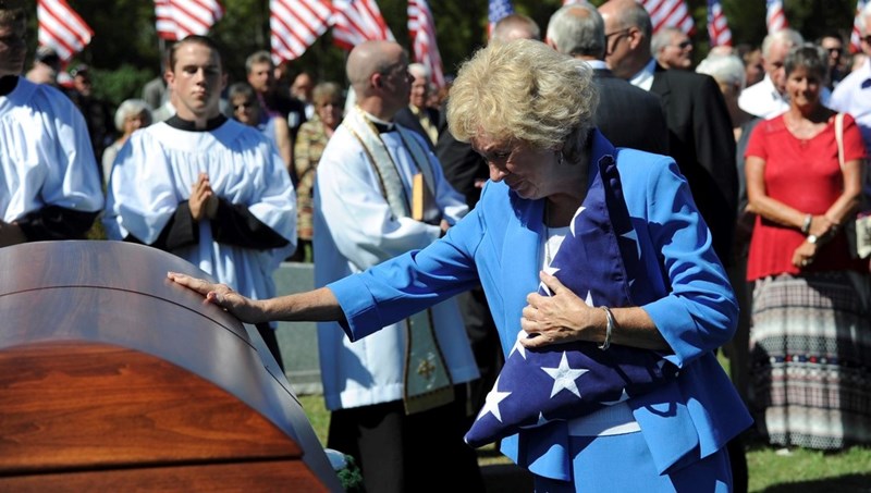 Dean Klenda's sister Deanna says goodbye to her brother at his funeral, September 17, 2016, 51 years to the day after he was shot down over North Vietnam. (U.S. Air Force)