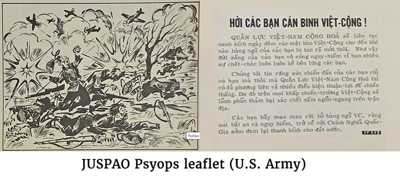 SOURCES: Herb Friedman, “Our Favorite Leaflets” and “Vietnam War Propaganda Posters,” PsyWarrior (accessed August 29, 2024); William M. Hammond, United States Army in Vietnam, Public Affairs: The Military and the Media, 1962-1968, Center of Military History, United States Army, Washington, D.C., 1990; Kyle K. Rable, “It’s an Image Problem: How Vietnamization Affected the PSYOP Mission,” Military Review, Army University Press, January 2023 (accessed August 30, 2024); “52. Memorandum From the Director of the United States Information Agency (Rowan) to President Johnson” (August 2, 1965), “54. Memorandum From the Special Assistant to the Director of the United States Information Agency (Keogh) to the Director-Designate (Marks)” (August 12, 1965 ), “78. News Release Prepared in the Office of Public Information, United States Information Agency” (February 11, 1966), and “103. Memorandum of Agreement on Direction and Supervision of U.S. Psychological Operations in Vietnam” (August 10, 1966), Foreign Relations of the United States, 1917–1972, Volume VII, Public Diplomacy, 1964–1968, U.S. Department of State Office of the Historian, Washington, D.C., 2018 (accessed August 29, 2024); “Transmittal of JUSPAO Field Memorandum No. 58” (August 27, 1968) and “Transmittal of JUSPAO PSYOP Policy Guidance No. 68” (August 23, 1968), HQ USMACV (accessed August 29, 2024); “Remembering LTC Ferdinand Ora Barger, Jr.,” Psyop Regimental Association, North Carolina Chapter (accessed August 29, 2024); “Wall of Faces,” Vietnam Veterans Memorial Fund (accessed August 29, 2024); “The Virtual Wall,” Vietnam Veterans Memorial Wall (accessed August 29, 2024); Coffelt Database of Vietnam Casualties (accessed August 29, 2024)