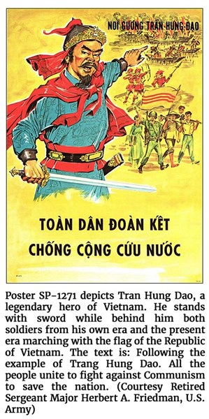 Poster SP-1271 depicts Tran Hung Dao, a legendary hero of Vietnam. He stands with sword while behind him both soldiers from his own era and the present era marching with the flag of the Republic of Vietnam. The text is: Following the example of Trang Hung Dao. All the people unite to fight against Communism to save the nation. (Courtesy Retired Sergeant Major Herbert A. Friedman, U.S. Army)Psyops advisers engaged in a wide range of activities. They prepared posters, leaflets, pamphlets, movies, and tapes (mostly related to the Chieu Hoi program, which was designed “to persuade Viet Cong to abandon their warfare and return to peaceable ways under government control”), and helped government teams cope with re-educating and rehabilitating Chieu Hoi “returnees.” They provided leaflets for local psywar air-drops (often personally pushing the bundles out of the plane) and wrote messages for air-borne loudspeaker missions. They provided “rice sacks printed with appropriate messages for repackaging food stores captured from the Viet Cong for distribution to the local citizenry,” and they started local newspapers in Vietnamese and tribal languages, often writing editorials and assisting with distribution. They “encouraged traditional drama troupes to entertain in remote districts with politically themed plays and dances,” and helped the Vietnamese military with “troop morale projects, providing camp libraries, publishing wall newspapers, providing projector boxes, films, etc., even using JUSPAO funds to purchase bed mats and mosquito nets for recruits who are ordinarily badly neglected.” And these are just a few of their typical projects. JUSPAO psyops officers kept a busy schedule.