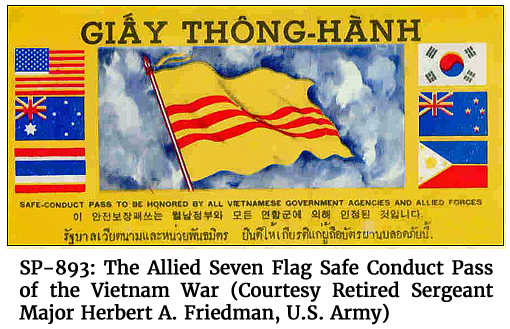 SP-893: The Allied Seven Flag Safe Conduct Pass of the Vietnam War (Courtesy Retired Sergeant Major Herbert A. Friedman, U.S. Army)By May 1965, in response to reports of duplication of efforts, inefficiency, and waste, President Johnson directed the U.S. Information Agency (USIA) to consolidate all psychological and informational activities in Vietnam under one roof. USIA immediately stood up a new interagency office, JUSPAO, to take charge both of news media relations and propaganda operations against the enemy. JUSPAO thereafter supervised all U.S. Information Service (USIS), U.S. Overseas Mission (USOM), U.S. Agency for International Development (USAID), and MACV public affairs efforts and psyops in an effort “to assure common policies and closer operational coordination” between U.S. civilian and military public communications missions.
