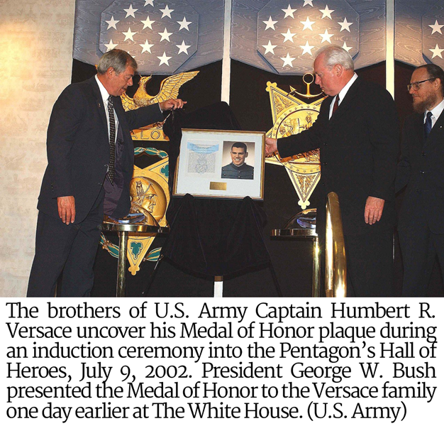 Versace was 28 years old when he was executed by his Viet Cong captors on September 26, 1965. For his unyielding courage and bravery while a prisoner of war, President George W. Bush posthumously awarded Versace the Medal of Honor in 2002. Versace is memorialized on panel 1E, line 33 of the Vietnam Veterans Memorial in Washington, D.C.1