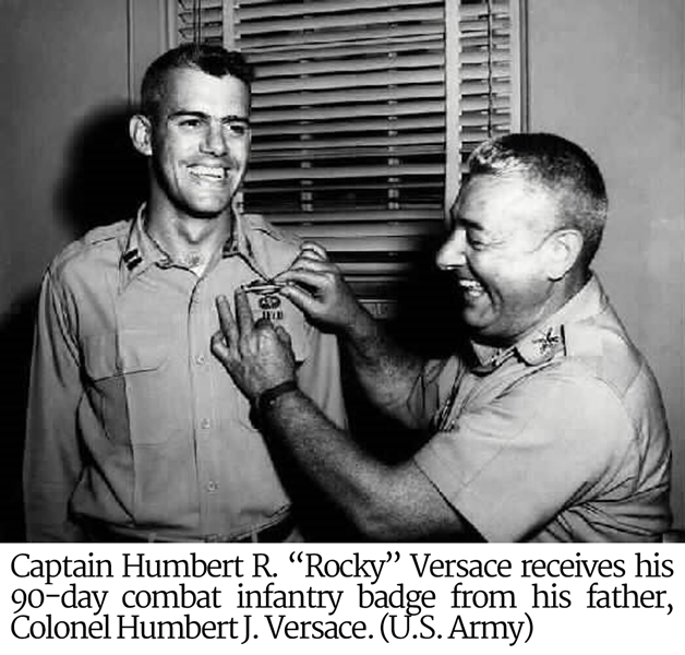 After graduation from West Point, class of 1959, Versace attended the Armor Officer Basic Course and Ranger School and then deployed in 1960 as a Medium Tank Platoon Leader to 3d Battalion, 40th Armor in Korea. The following year, he returned to Fort Myer, Virginia to serve as a tank platoon leader with the 3d Infantry. Additional training took him to the Military Assistance Institute in Arlington, Virginia, the Intelligence Course at Fort Holabird, Maryland, and to USACS Presidio Language School in Monterey, California. He then volunteered to go to Vietnam in May 1962, as an intelligence adviser in Xuan Loc, III Corps. He served briefly as assistant G-2 adviser with the 5th Infantry Division in Bien Hoa, before joining Advisory Team 70 in 1963 as the Military Assistance Advisory Group (MAAG) intelligence adviser at An Xuyen in IV Corps.