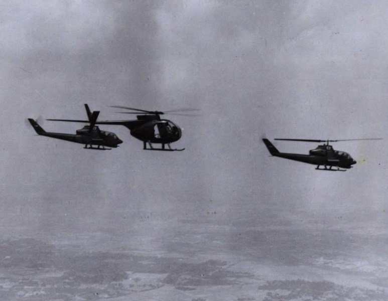 Two Cobras and a “Loach” helicopter on a mission near Phuoc Vinh, South Vietnam, 1969. (U.S. Army)