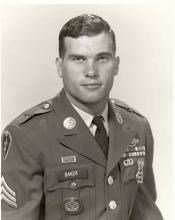 For conspicuous gallantry and intrepidity in action at the risk of his life above and beyond the call of duty. En route to assist another unit that was engaged with the enemy, Company A came under intense enemy fire and the lead man was killed instantly. Sgt. Baker immediately moved to the head of the column and together with another soldier knocked out 2 enemy bunkers. When his comrade was mortally wounded, Sgt. Baker, spotting 4 Viet Cong snipers, killed all of them, evacuated the fallen soldier and returned to lead repeated assaults against the enemy positions, killing several more Viet Cong. Moving to attack 2 additional enemy bunkers, he and another soldier drew intense enemy fire and Sgt. Baker was blown from his feet by an enemy grenade. He quickly recovered and single-handedly destroyed 1 bunker before the other soldier was wounded. Seizing his fallen comrade's machine gun, Sgt. Baker charged through the deadly fusillade to silence the other bunker. He evacuated his comrade, replenished his ammunition and returned to the forefront to brave the enemy fire and continue the fight. When the forward element was ordered to withdraw, he carried 1 wounded man to the rear. As he returned to evacuate another soldier, he was taken under fire by snipers, but raced beyond the friendly troops to attack and kill the snipers. After evacuating the wounded man, he returned to cover the deployment of the unit. His ammunition now exhausted, he dragged 2 more of his fallen comrades to the rear. Sgt. Baker's selfless heroism, indomitable fighting spirit, and extraordinary gallantry were directly responsible for saving the lives of several of his comrades, and inflicting serious damage on the enemy. His acts were in keeping with the highest traditions of the U.S. Army and reflect great credit upon himself and the Armed Forces of his country.