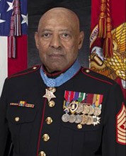 For conspicuous gallantry and intrepidity at the risk of his life above and beyond the call of duty in action against the enemy while serving as Company Gunnery Sergeant, Company A, First Battalion, First Marines, First Marine Division from 31 January to 6 February 1968, in the Republic of Vietnam. Company A fought off multiple vicious attacks as it rapidly moved along the highway toward Hue City to relieve friendly forces that were surrounded by enemy forces. Despite being wounded in these engagements, Gunnery Sergeant Canley repeatedly rushed across fire-swept terrain to carry his wounded Marines to safety. After his commanding officer was severely wounded, Gunnery Sergeant Canley took command and led the company into Hue City. At Hue City, caught in deadly crossfire from enemy machine gun positions, he set up a base of fire and maneuvered with a platoon in a flanking attack that eliminated several enemy positions. Retaining command of the company for three days, he led attacks against multiple enemy fortified positions while routinely braving enemy fire to carry wounded Marines to safety. On 4 February, he led a group of Marines into an enemy-occupied building in Hue City. He moved into the open to draw fire, located the enemy, eliminated the threat, and expanded the company’s hold on the building room by room. Gunnery Sergeant Canley then gained position above the enemy strongpoint and dropped in a large satchel charge that forced the enemy to withdraw. On 6 February, during a fierce firefight at a hospital compound, Gunnery Sergeant Canley twice scaled a wall in full view of the enemy to carry wounded Marines to safety. By his undaunted courage, selfless sacrifice, and unwavering devotion to duty, Gunnery Sergeant Canley reflected great credit upon himself and upheld the highest traditions of the Marine Corps and the United States Naval Service.