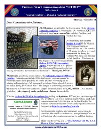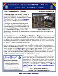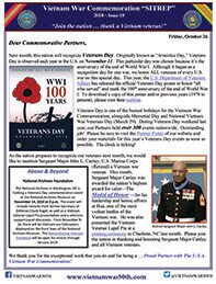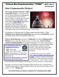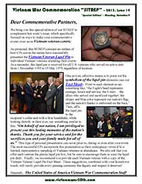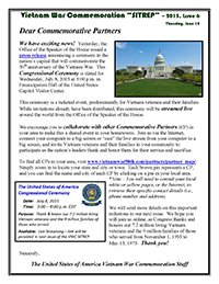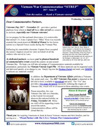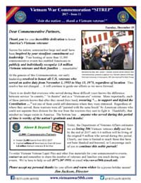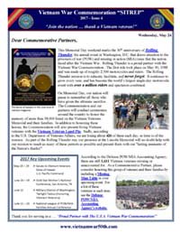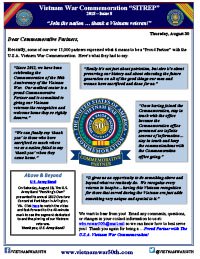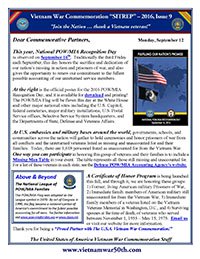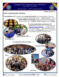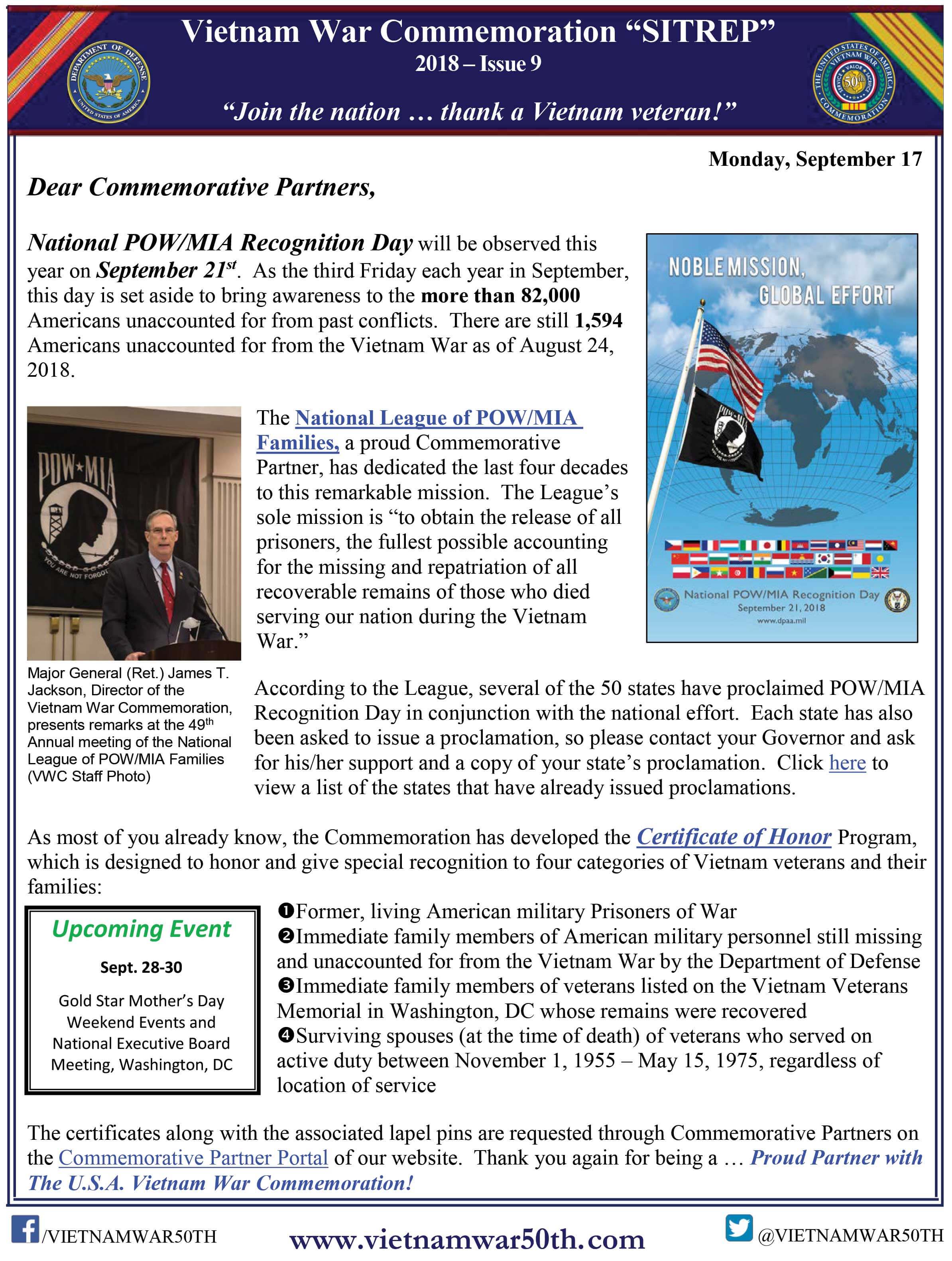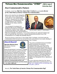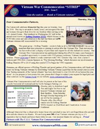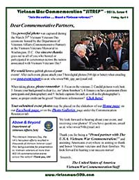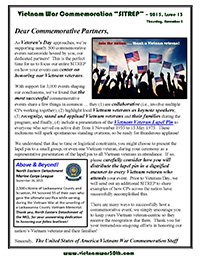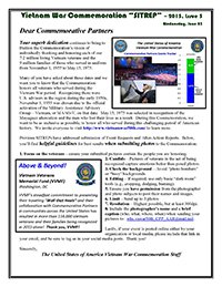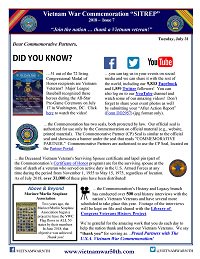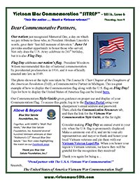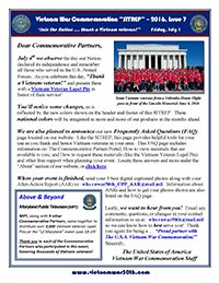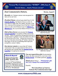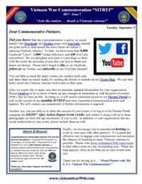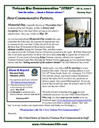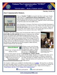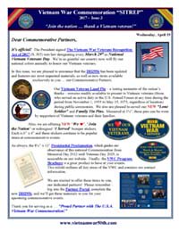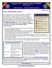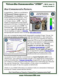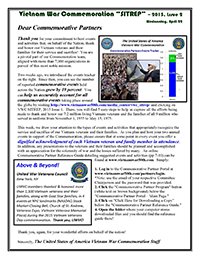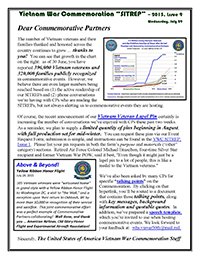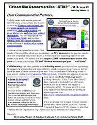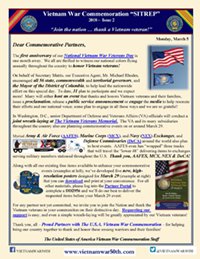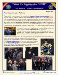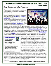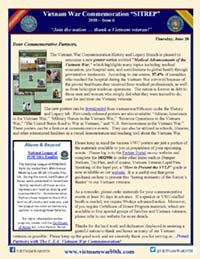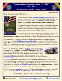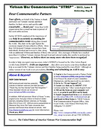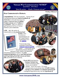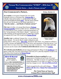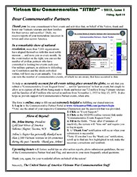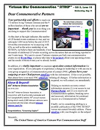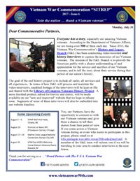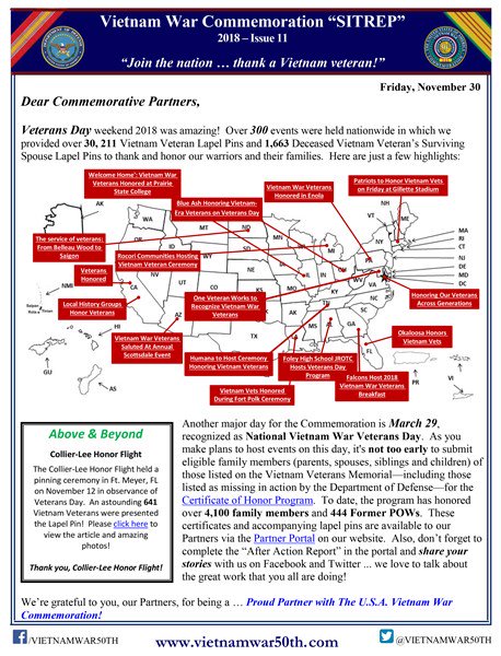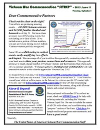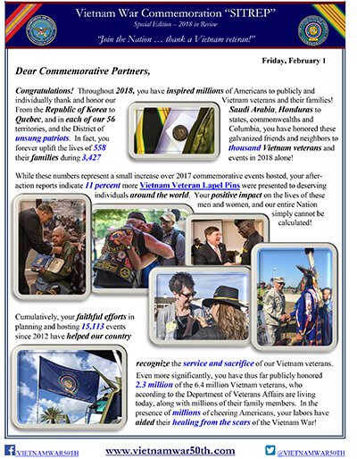 Our SITREP is a one-page communiqué focusing on key Commemoration issues. The term “SITREP,” short for Situational Report, was used by our military during the Vietnam War and refers to an update on any given situation. The purpose of our SITREPs are to provide an efficient, effective means of sharing important Commemoration information and updates with our Commemorative Partners (CP). This regular communiqué provides updates, addresses some of the most frequently asked questions, and highlights some of our CPs’ amazing accomplishments. Have a topic you would like to see addressed? Contact us at whs.vnwar50th@mail.mil for consideration.