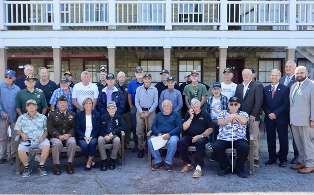Group photo of pinned Vietnam veterans with U.S. Representative Claudia Tenney, (NY-24) seated (third from left) beside VWC Staff Member, DAG Chief, U.S. Army LTC James Tom (seated, second from left).