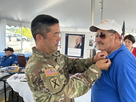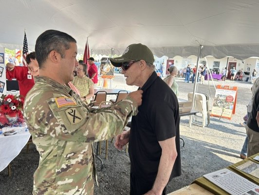 VWC's Col. Tom pins former POW and Vietnam veteran SSgt David Harker, U.S. Army.