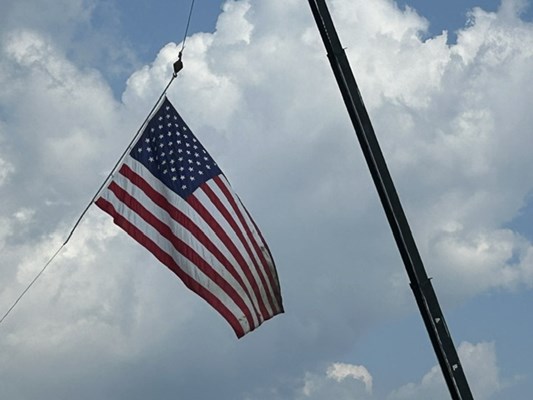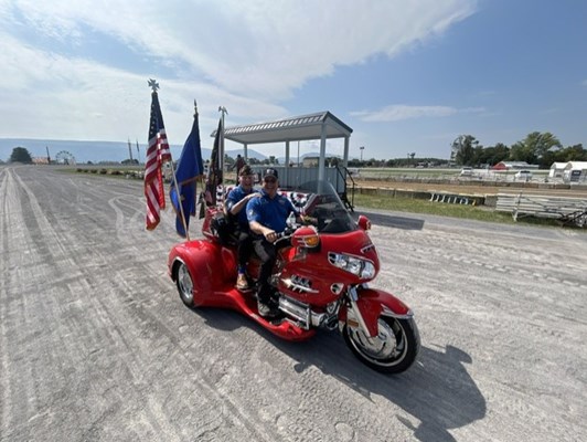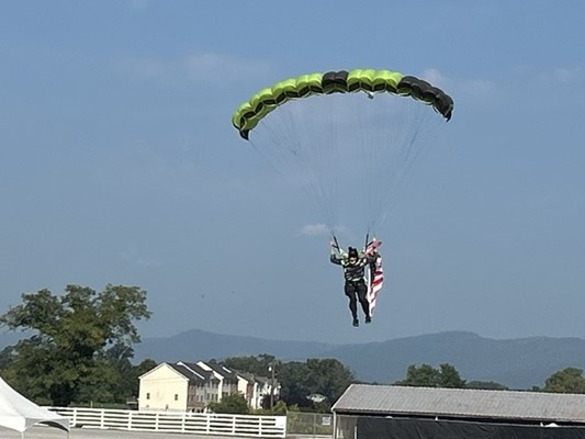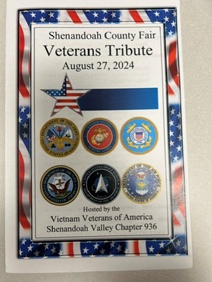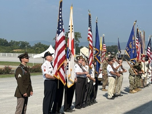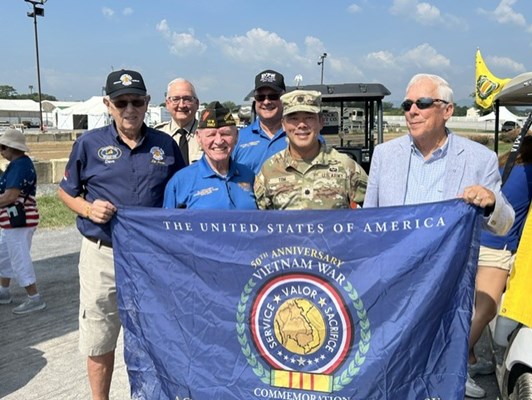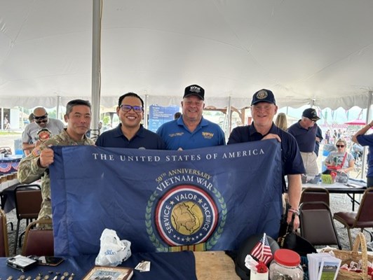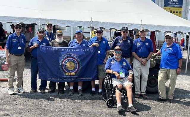 Members of VVA Shenandoah Chapter 936, VFW National Commander Al Lipphardt, VWC's Col. Tom and former POW and Vietnam veteran David Harker, U.S. Army, stand together holding a VWC Commemorative Flag.