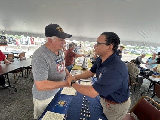VFW National Commander Al Lipphardt shakes the hand of a VVA member.
