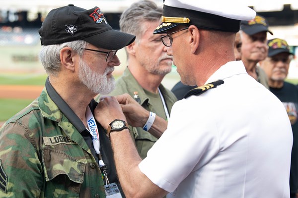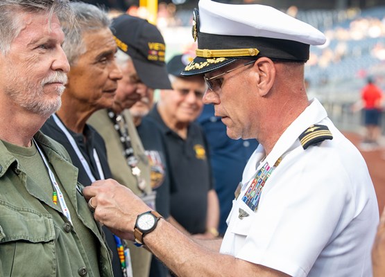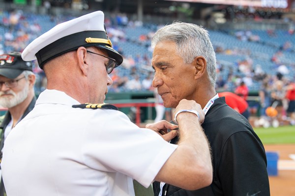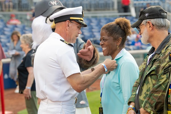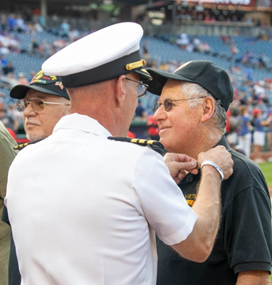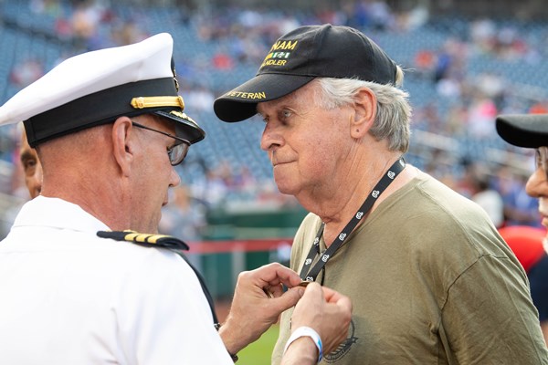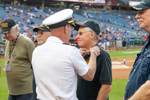 VWC Public Engagement Chief, Commander Brian Wierzbicki presents Vietnam Veteran Lapel Pins during The Washington National's pre-game.