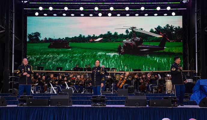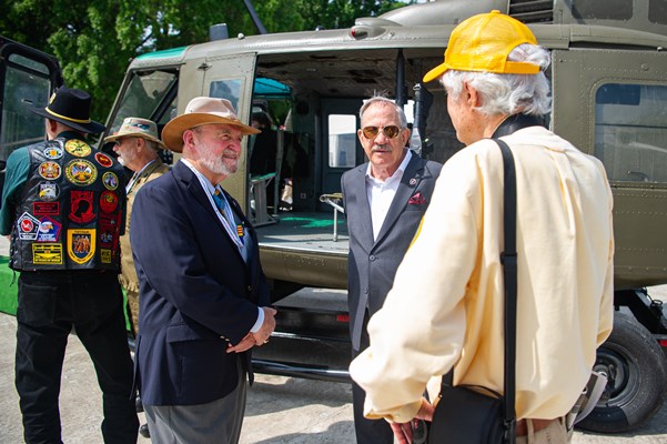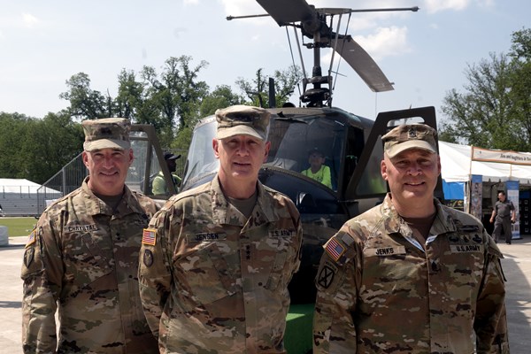Army National Guard Director, U.S. Army Lt. Gen. John A. Jensen (center), joins VWC Director, U.S. Army Maj. Gen. Edward J. Chrystal (left) and CSM Robert D. Jenks in front of the Vietnam War period Huey static helicopter displays during Welcome Home.