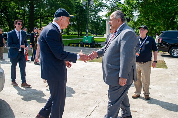 At left, U.S. Senator Tom Carper (DE) and Secretary of the Navy Carlos Del Toro (at right) greet each other.