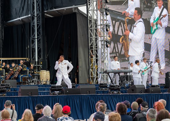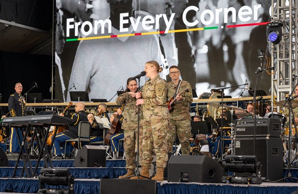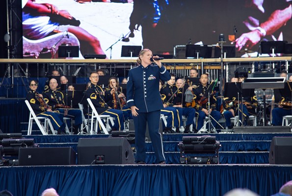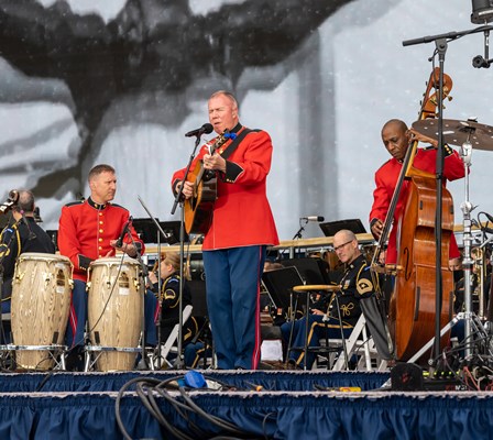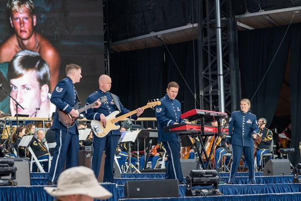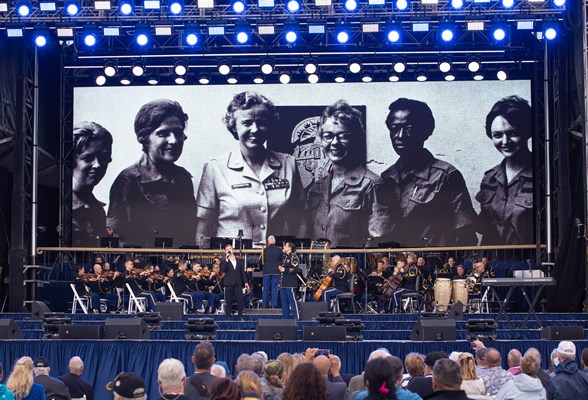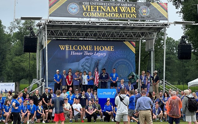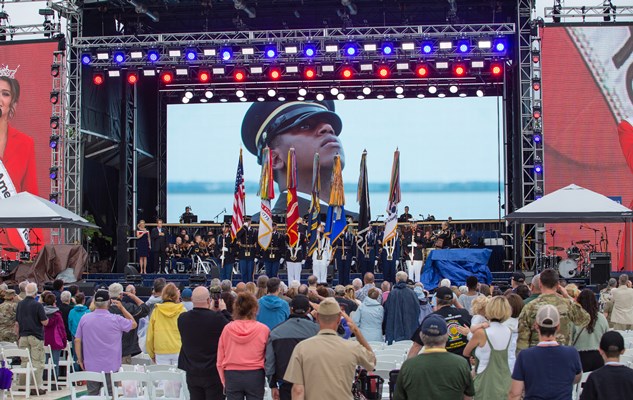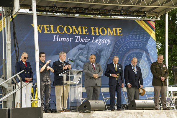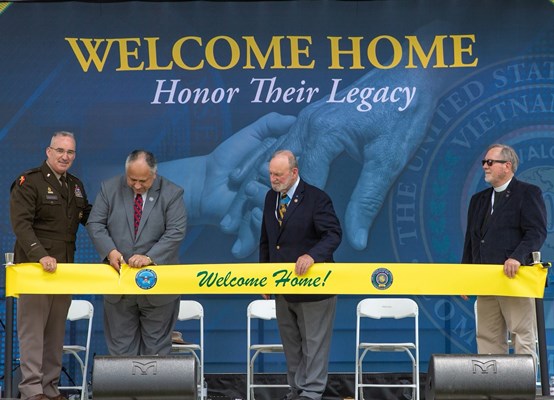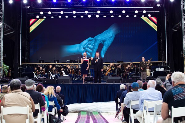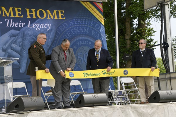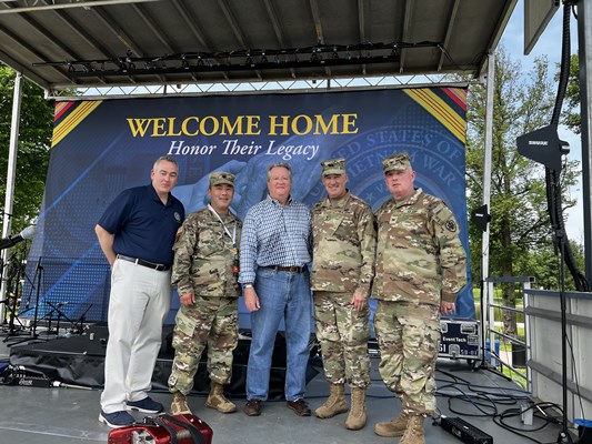 Pictured (left to right) on the Welcome Home stage are VWC's Chief of Future and Current Operations, Mr. Chuck Crosby, U.S. Army Lieutenant Colonel James Tom, Singer Pat Garvey and U.S. Army Maj. Gen. Edward J. Chrystal, Jr., VWC Director